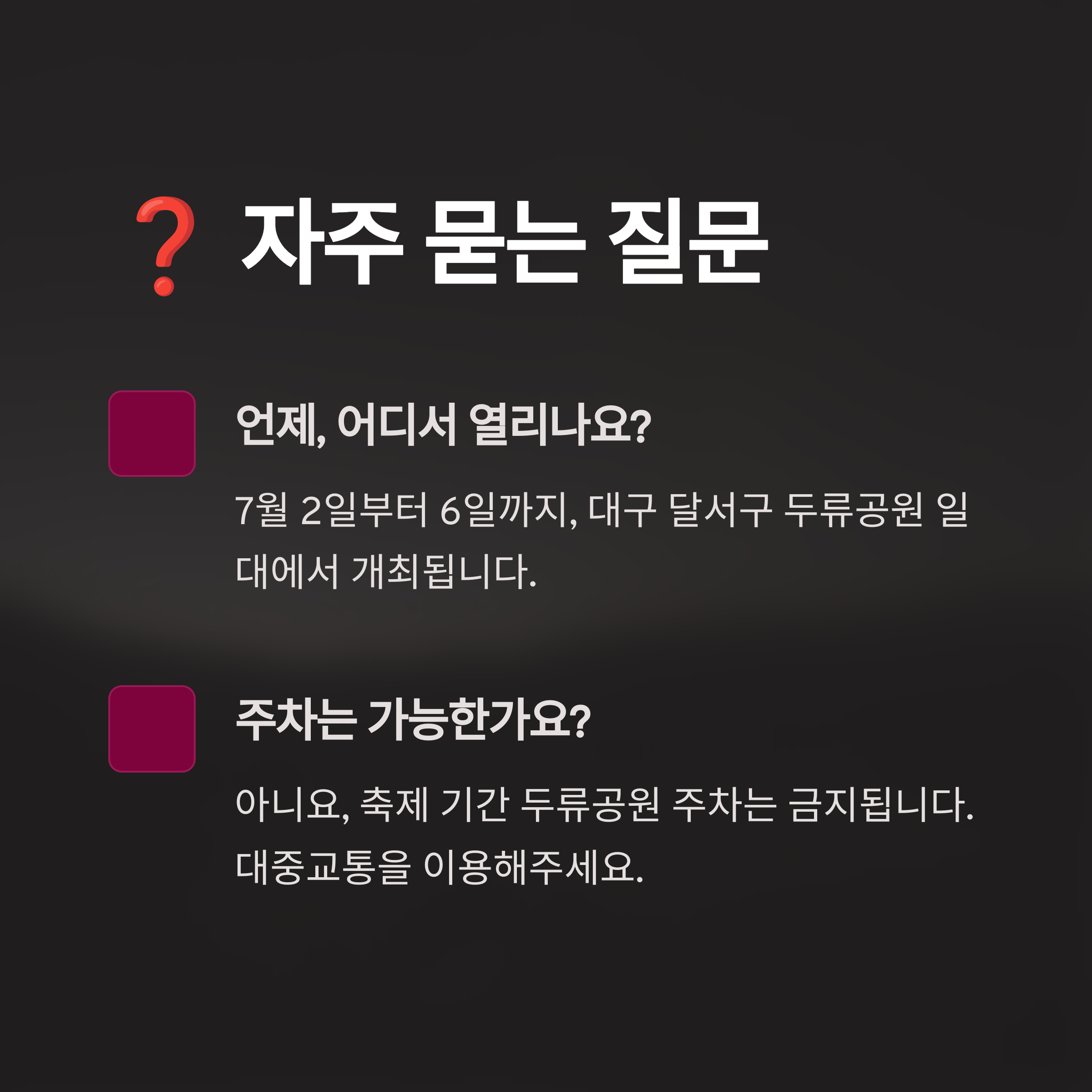 A3: 아니요, 축제 기간 동안 두류공원 일대는 주차가 전면 금지되며 차량 통제가 이루어집니다. 안전하고 원활한 축제 진행을 위해 대중교통 이용을 강력히 권장합니다.