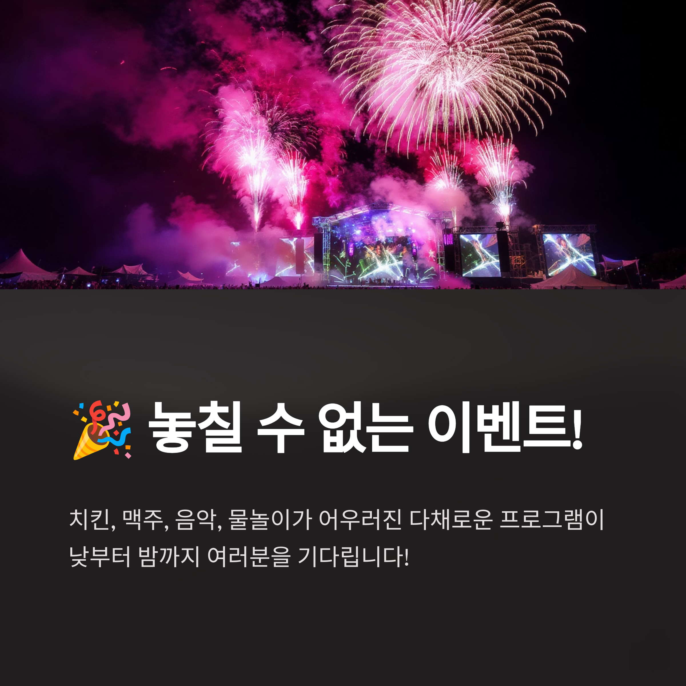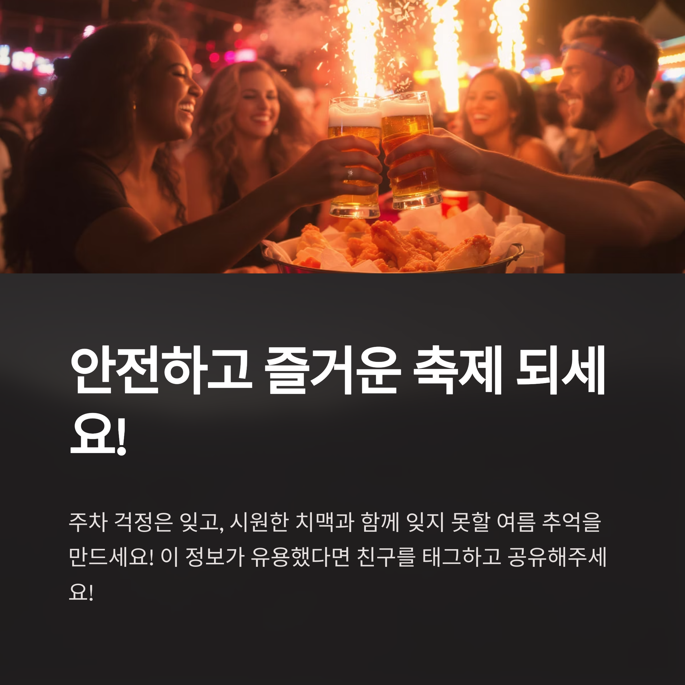 주차 걱정은 잊고, 시원한 치맥과 함께 신나는 공연, 그리고 뜨거운 여름밤의 열기를 마음껏 즐겨보세요! 이번 축제가 여러분에게 잊지 못할 즐거운 추억을 선사할 거라고 확신합니다. 모두 안전하고 즐거운 대구 치맥 페스티벌 되세요!