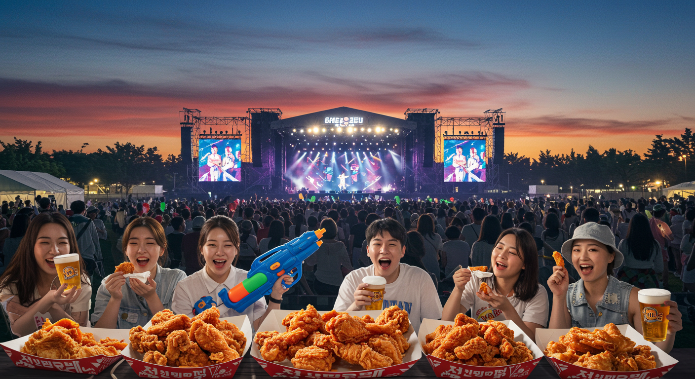 A5: 낮에는 물총 축제가 열리는 치맥 워터피아 존, 밤에는 초호화 가수 공연과 워터 EDM DJ 쇼 및 워터콘 EDM 파티가 진행됩니다. 관람객이 함께 참여하는 치맥99건배타임도 놓칠 수 없는 프로그램이에요.
