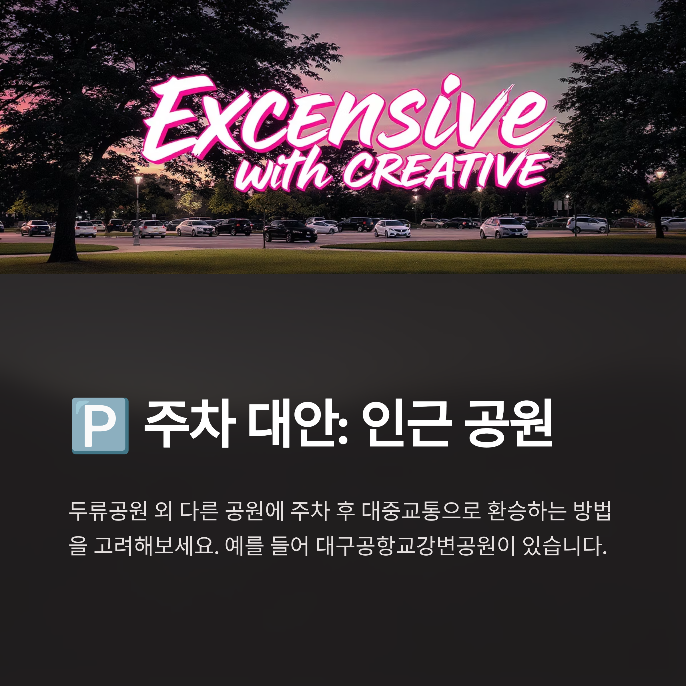 A4: 두류공원 주변의 공영주차장이나 대구시내의 다른 공원(예: 대구공항교강변공원)에 주차 후 대중교통으로 환승하는 방법을 고려해볼 수 있습니다. 인근 상업시설 주차장도 대안이 될 수 있지만, 대중교통 연계를 꼭 확인하세요.