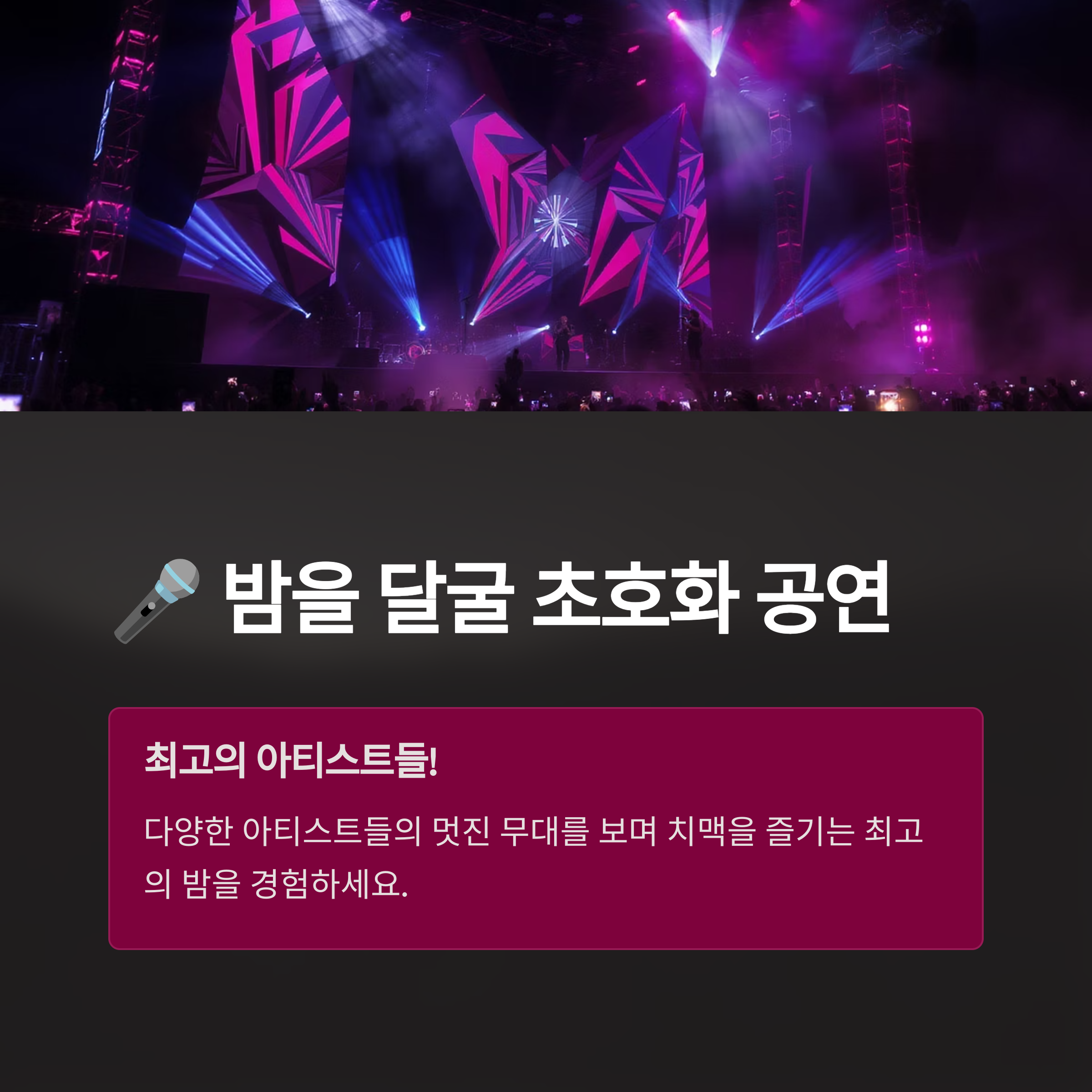 | 초호화 가수 공연 | 밤 시간 다양한 아티스트들의 무대 |