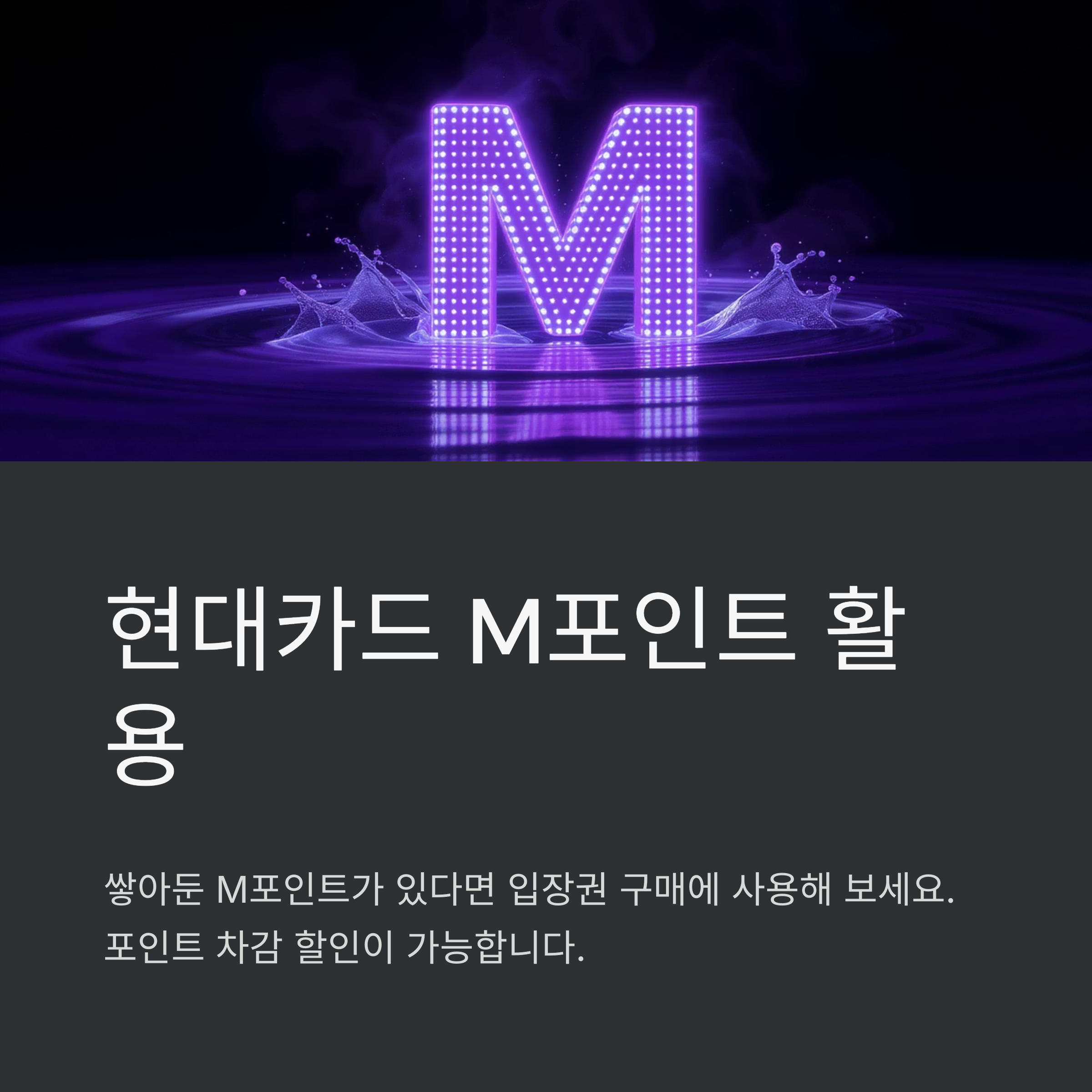 현대카드를 가지고 계신 분들이라면 M포인트를 활용한 할인도 눈여겨볼 만해요. 일정 조건 하에 포인트 차감 할인이 적용되니, 쌓아둔 M포인트가 있다면 이번 기회에 캐리비안베이 입장권 구매에 사용해보는 건 어떨까요?