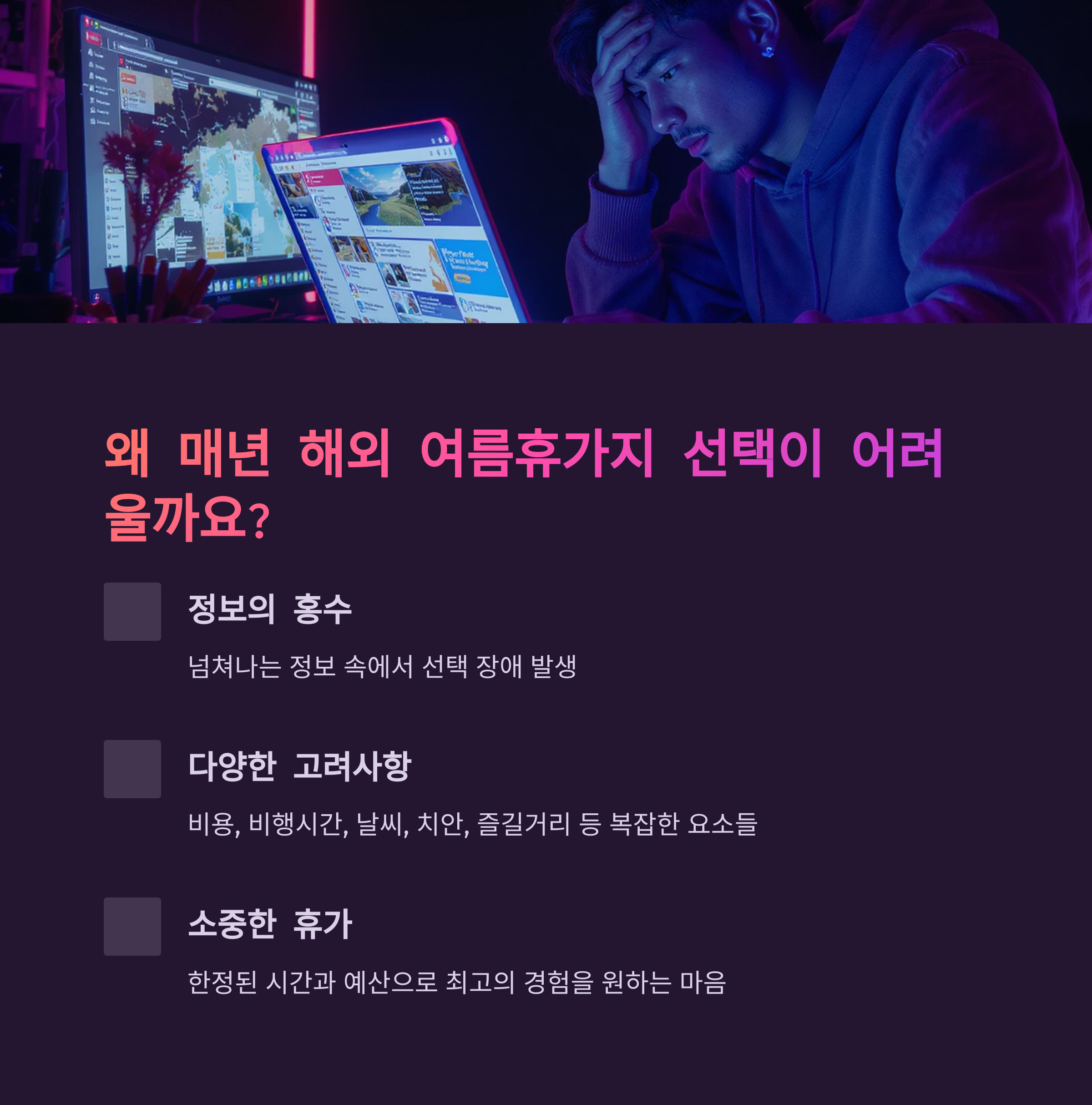 여러분, 매년 여름이 다가오면 해외 여름휴가지 선정 때문에 머리가 지끈거리는 경험, 다들 있으시죠? 정말 많은 사람들이 같은 고민을 하고 있다는 사실에 안심해도 좋아요. 정보의 홍수 속에서 나에게 딱 맞는 곳을 찾기란 여간 어려운 일이 아니거든요. 특히 한 번 가는 소중한 휴가인데, 실패하고 싶지 않은 마음이 크잖아요? 비용, 비행시간, 현지 날씨, 치안, 즐길 거리 등 고려해야 할 점이 한두 가지가 아니라서 더욱 그렇죠.