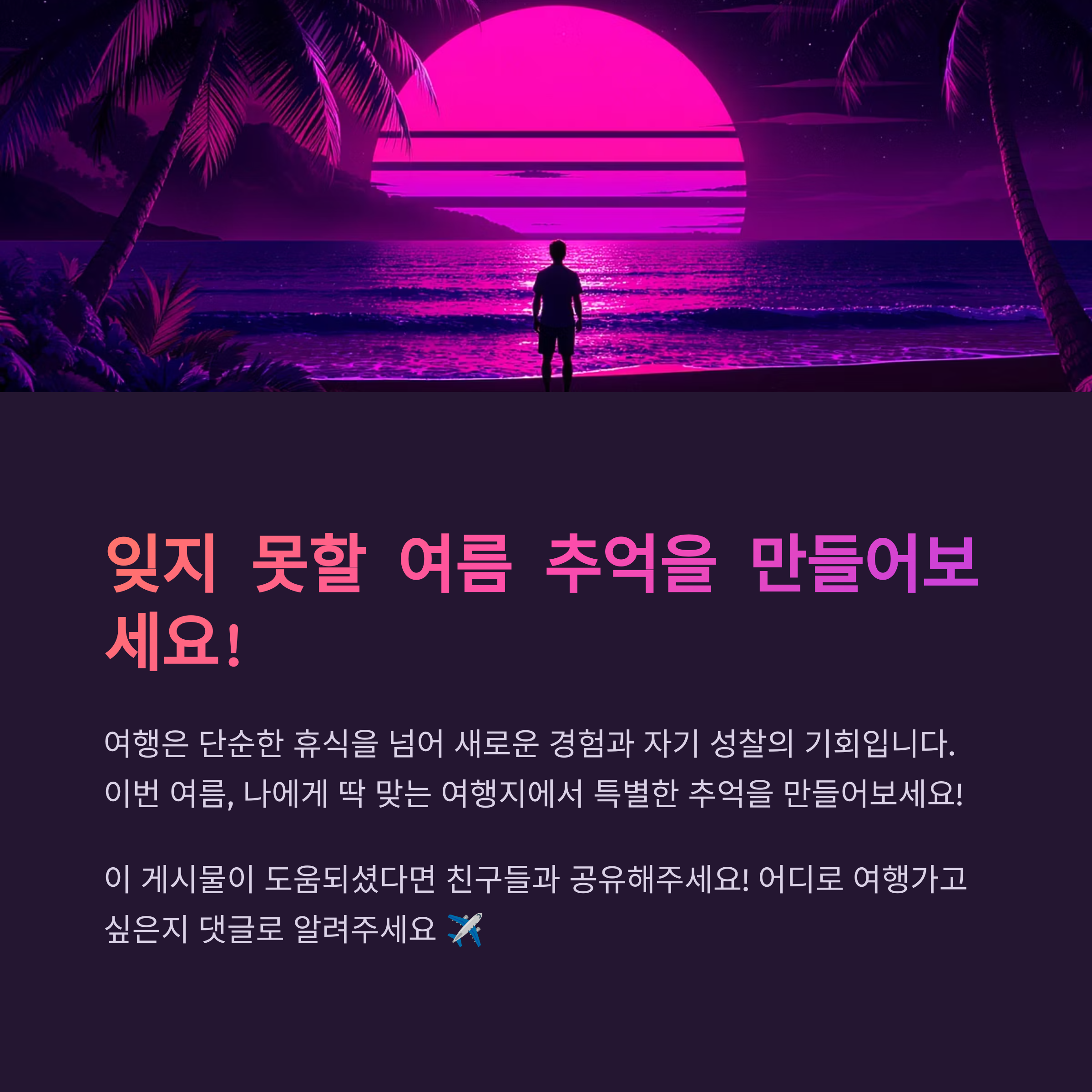 여행은 단순한 휴식을 넘어 새로운 경험을 하고, 견문을 넓히며, 자신을 돌아보는 소중한 기회가 된답니다. 이번 여름에는 사랑하는 사람들과 함께, 또는 오롯이 나 자신만을 위해 떠나는 해외 여름휴가지에서 잊지 못할 추억을 만들어보세요. 일상의 모든 스트레스는 잠시 잊고, 오직 즐거움과 행복만이 가득한 시간이 되기를 응원할게요! 안전하고 행복한 여행 되시길 바랍니다! 😊
