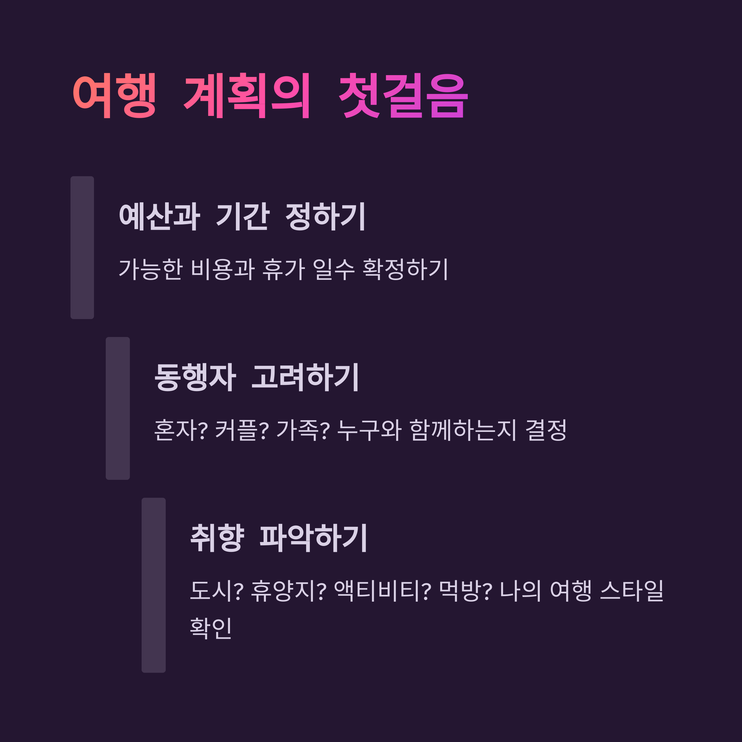 복잡한 도시를 좋아하시나요, 아니면 한적한 휴양지를 선호하시나요? 액티비티를 즐기시나요, 아니면 먹방 투어가 더 중요하신가요? 이런 질문에 대한 답을 찾는 것이 첫걸음이에요.