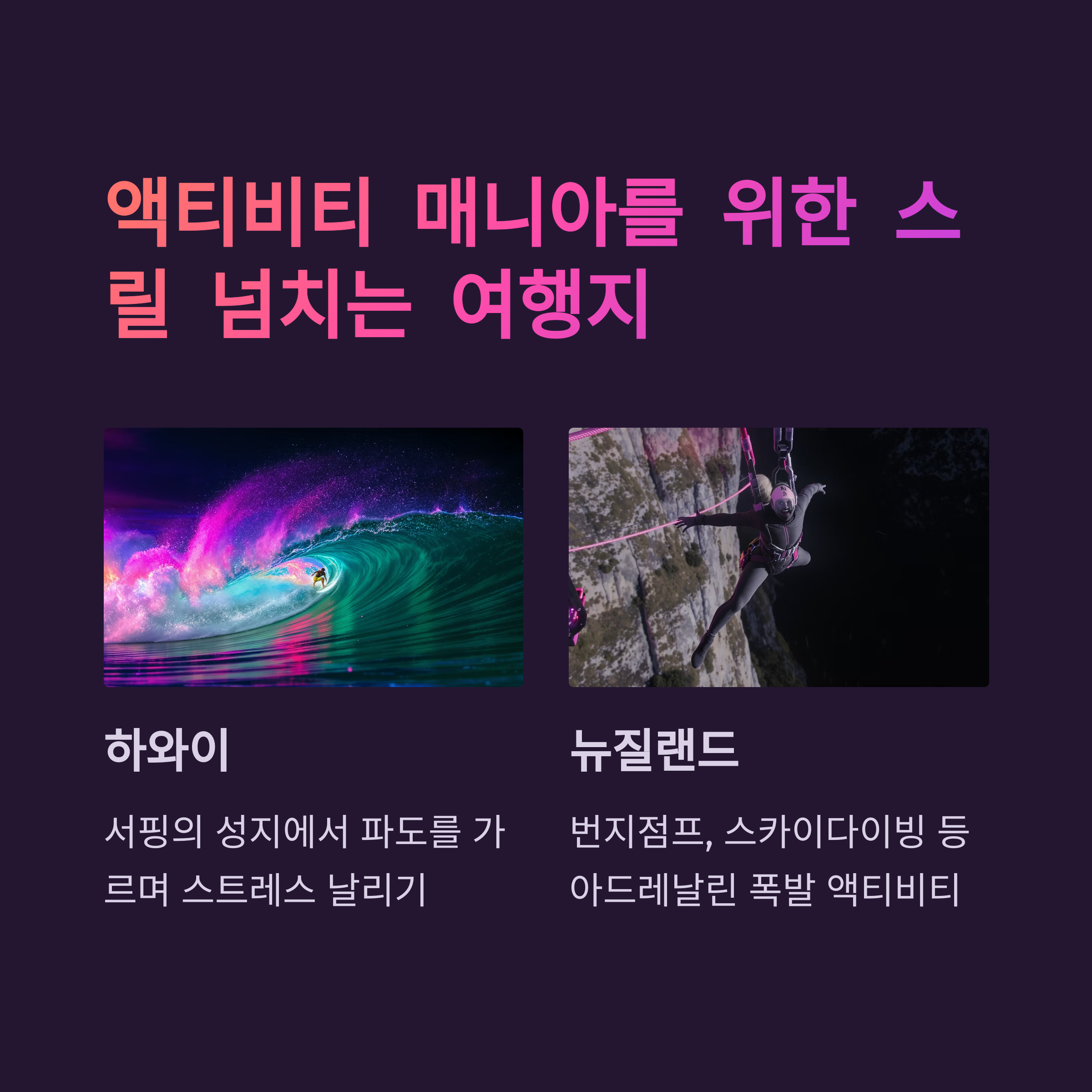 | 액티비티/모험 | 스쿠버 다이빙, 서핑, 트레킹 | 하와이, 발리, 뉴질랜드 |
