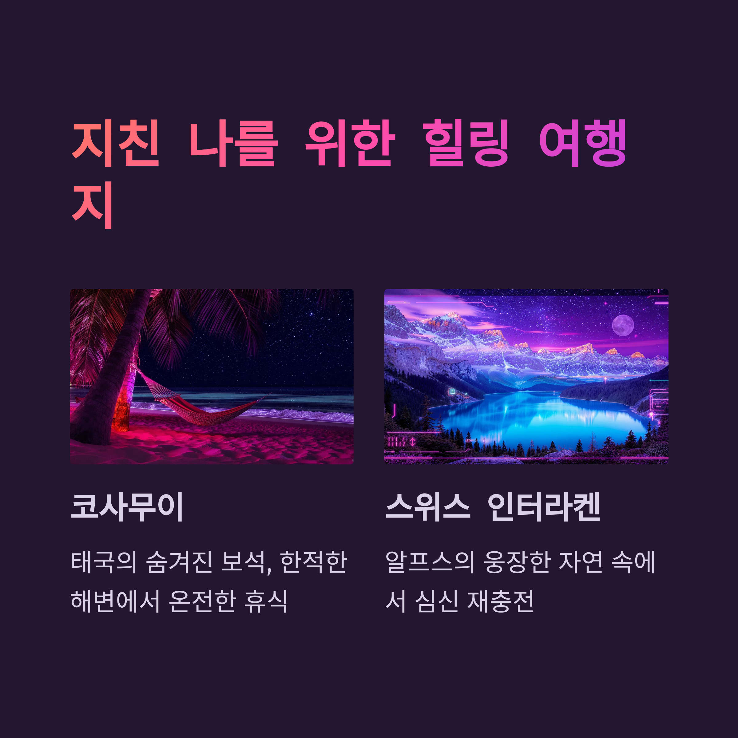 | 힐링/휴식 | 스파, 요가, 해변 휴식 | 몰디브, 코사무이, 보라카이 |