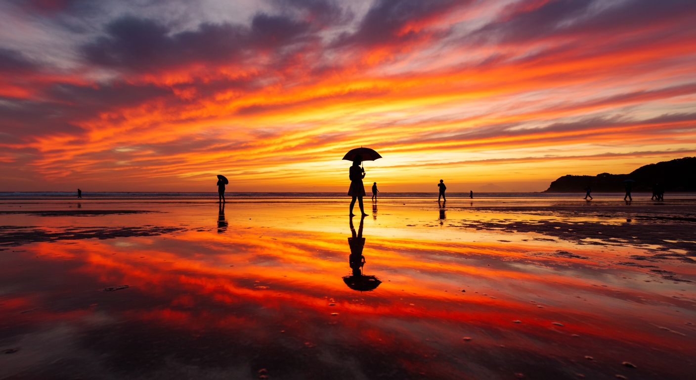 약 1km에 이르는 길고 완만한 해변은 간조 시기에 더욱 넓게 펼쳐져 마치 거대한 거울 위에 서 있는 듯한 착각을 불러일으켜요. 특히 해 질 녘 노을이 물들어갈 때면 하늘의 붉은색과 주황색이 수면에 그대로 비치면서 그야말로 황홀경이 펼쳐진답니다. 이 아름다운 풍경 덕분에 일본 내에서도 '가고 싶은 석양 절경' 랭킹 1위를 차지하기도 했어요. 저도 눈으로 보고도 믿기지 않을 정도로 너무 아름다웠답니다.