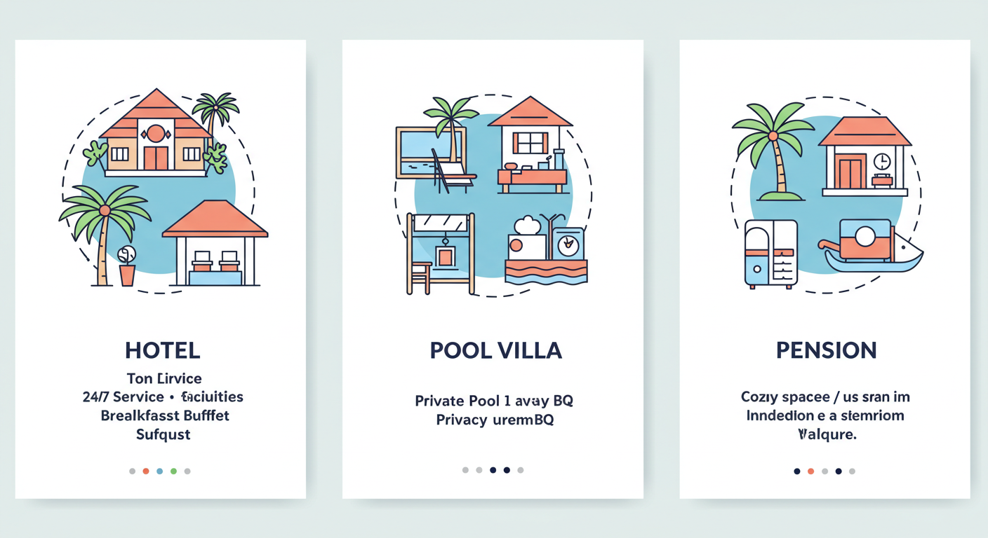 호텔은 편리한 서비스와 다양한 부대시설을 원할 때, 풀빌라는 누구의 방해도 받지 않는 프라이빗한 휴식을 원할 때, 그리고 펜션은 좀 더 아늑하고 편안한 공간에서 취사나 바비큐 같은 활동을 즐기고 싶을 때 좋은 선택지가 될 수 있습니다.