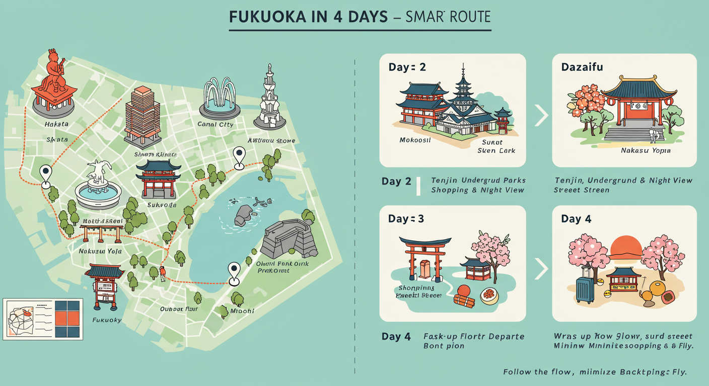 여행 계획 짜는 게 세상에서 제일 어렵게 느껴지는 분들을 위해, 제가 직접 다녀오고 만족했던 3박 4일 코스를 공유해 드릴게요. 이 코스는 후쿠오카의 핵심 명소와 맛집, 쇼핑 스팟을 효율적으로 둘러볼 수 있도록 구성했어요. 물론 개인의 취향에 따라 유연하게 변경하셔도 좋아요! 이 코스만 따라와도 알찬 후쿠오카 자유여행을 즐길 수 있을 거예요. 핵심은 동선을 최소화하면서 다양한 경험을 하는 것이랍니다.