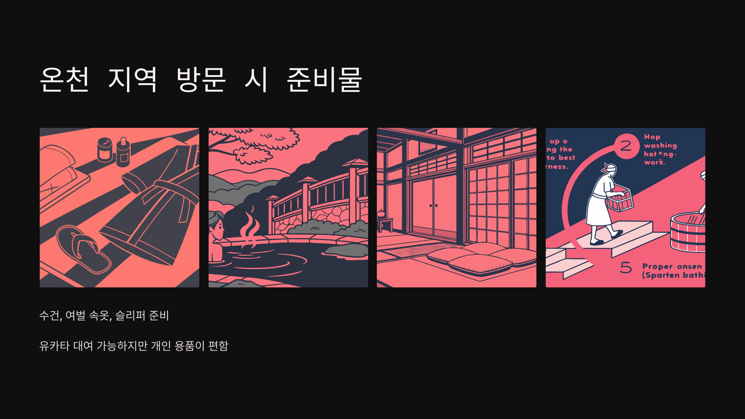온천 지역 방문 계획이 있다면 수건이나 여벌 속옷, 슬리퍼도 챙기면 좋아요. 유카타 대여를 할 수 있는 곳도 많지만, 위생상 본인 용품이 편하다는 사람도 많아요.