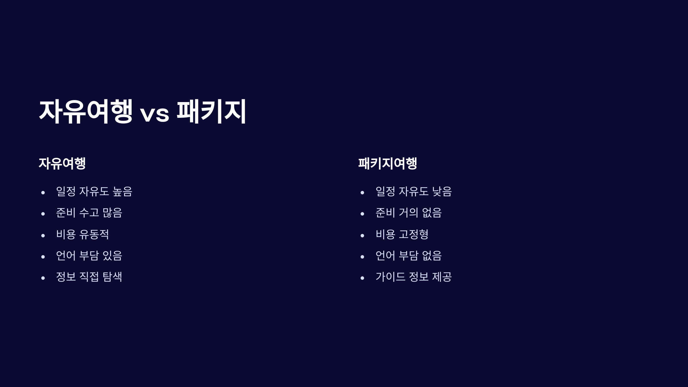 | 구분 | 자유여행 | 패키지여행 |