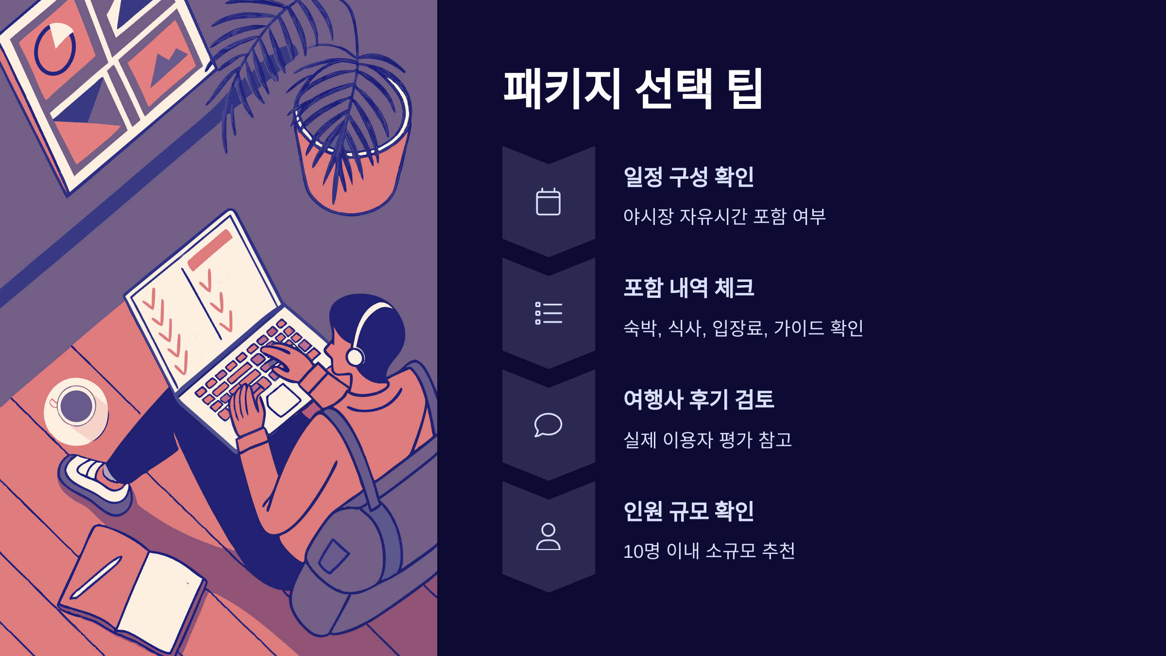 두 번째는 **포함 내역 확인**이에요. 숙박, 식사, 입장료, 가이드 여부까지 꼼꼼히 살펴봐야 해요. 가끔은