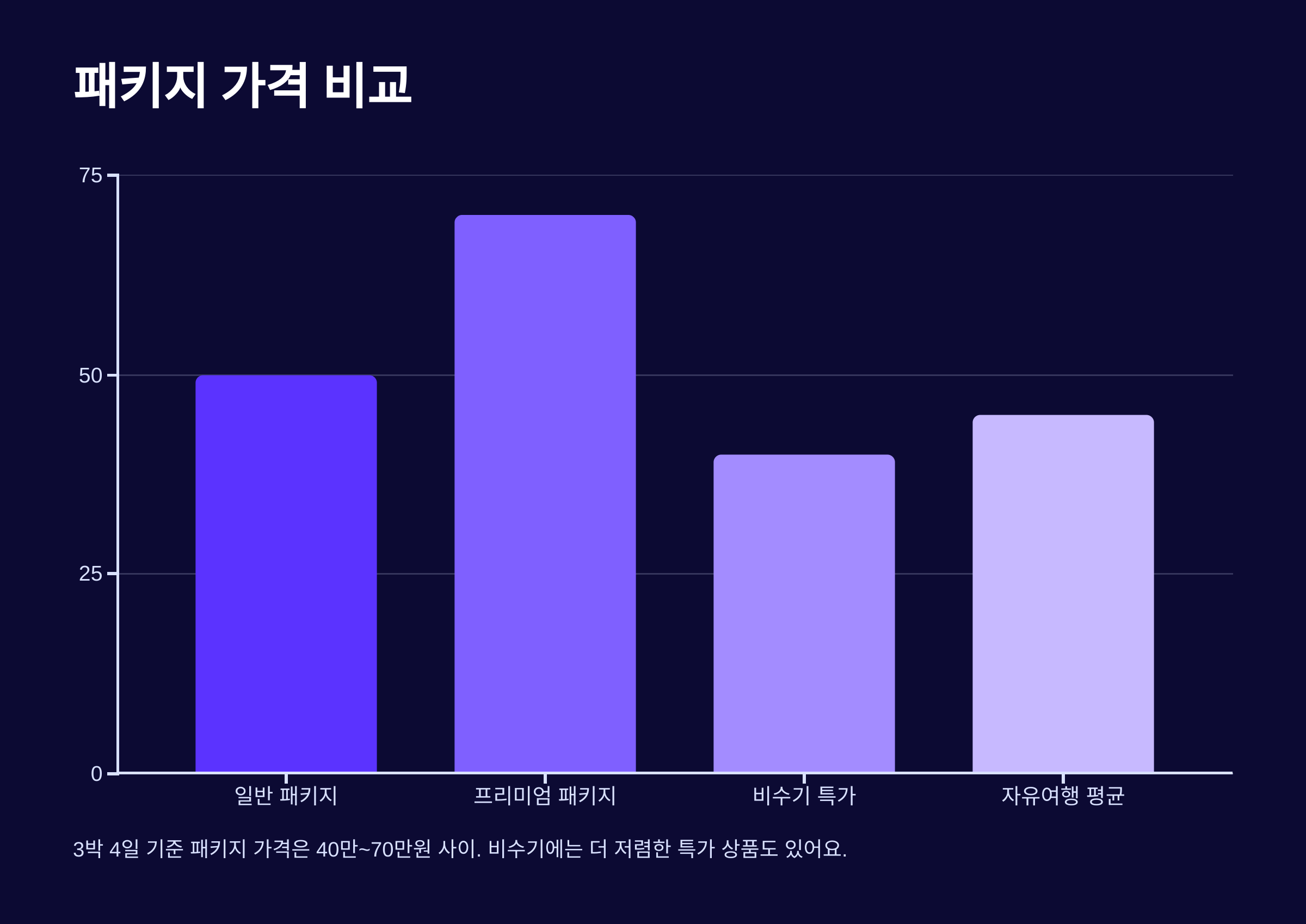 A4. 3박 4일 기준으로 약 40만~70만 원 사이예요. 비수기에는 더 저렴한 특가도 있어요.
