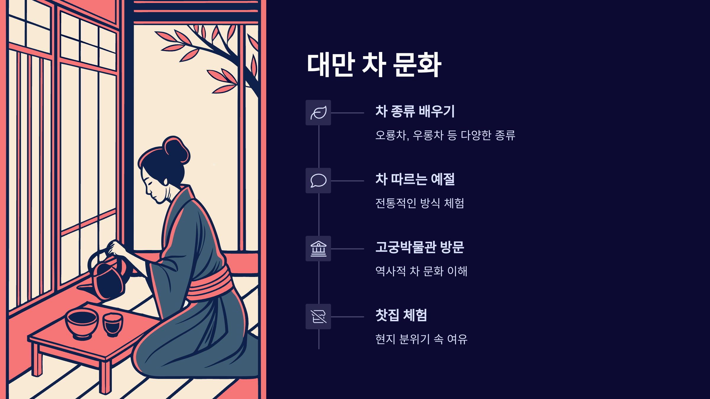 이 포함돼 있어요. 여기서는 차를 따르는 예절과 차 종류에 대해 배울 수 있어서 문화적으로도 큰 의미가 있어요.
