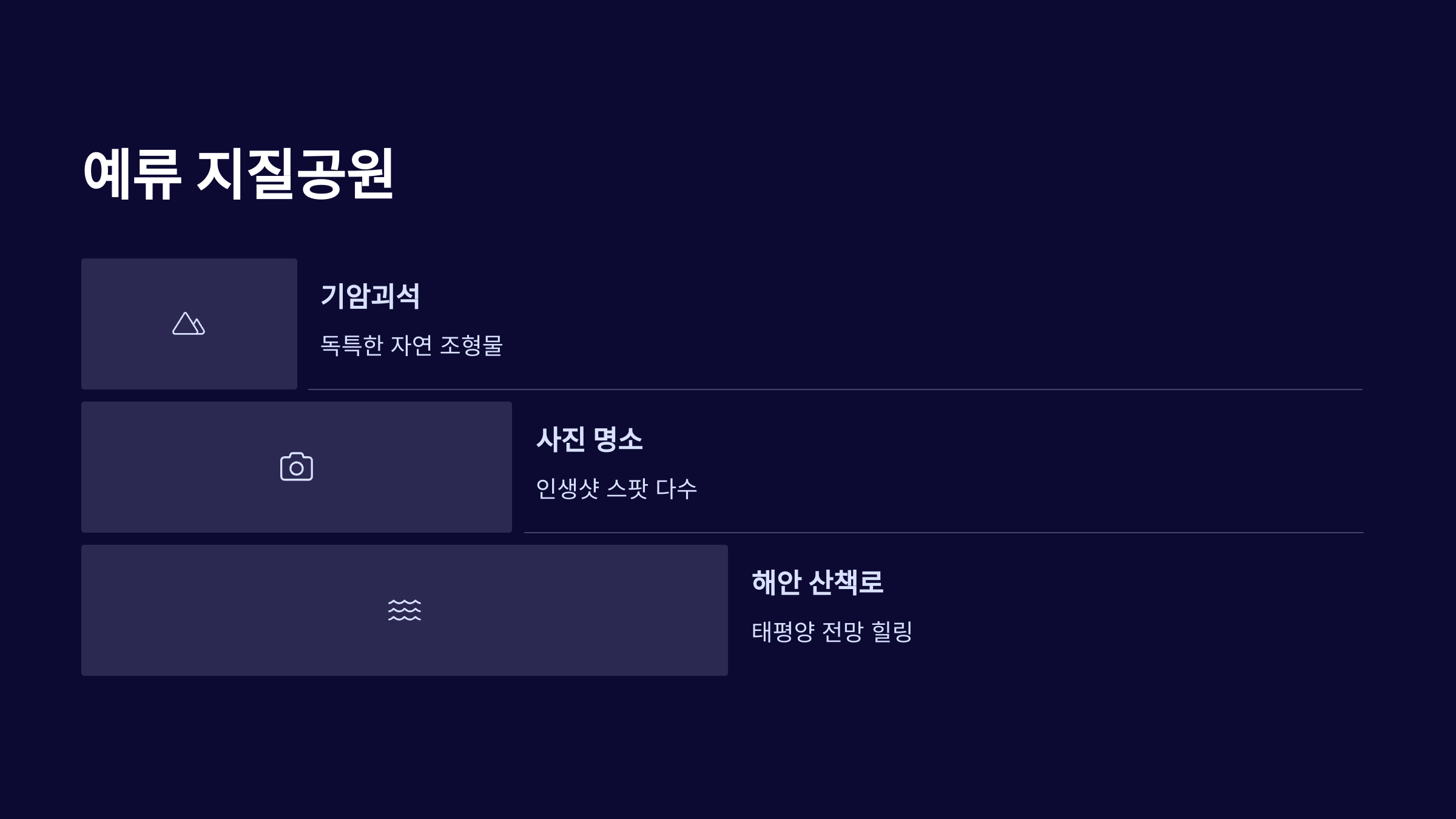 이 추천돼요. 해안선을 따라 형성된 기암괴석들은 정말 독특한 형태를 자랑해요. 사진 찍기 좋은 스팟도 많고, 태평양을 바라보며 걷는 산책로는 힐링 그 자체예요.