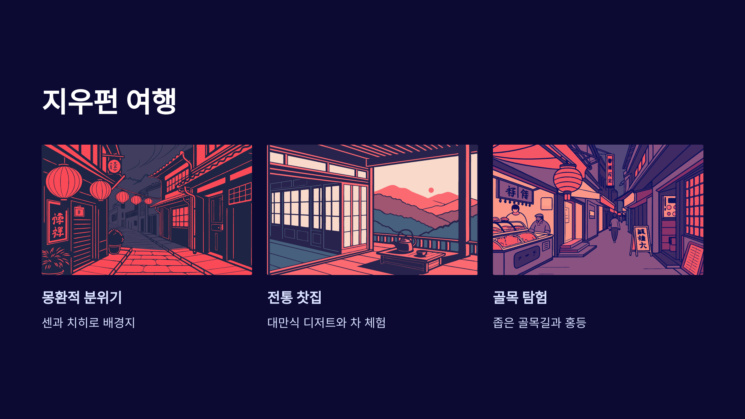 그다음은 지우펀(九份)이에요. 애니메이션 ‘센과 치히로’의 배경으로 유명한 이곳은 좁은 골목길과 홍등이 어우러진 몽환적인 분위기로 유명하죠. 여기서는 찻집에 앉아 대만식 디저트를 즐기며 시간을 보내기 좋아요.