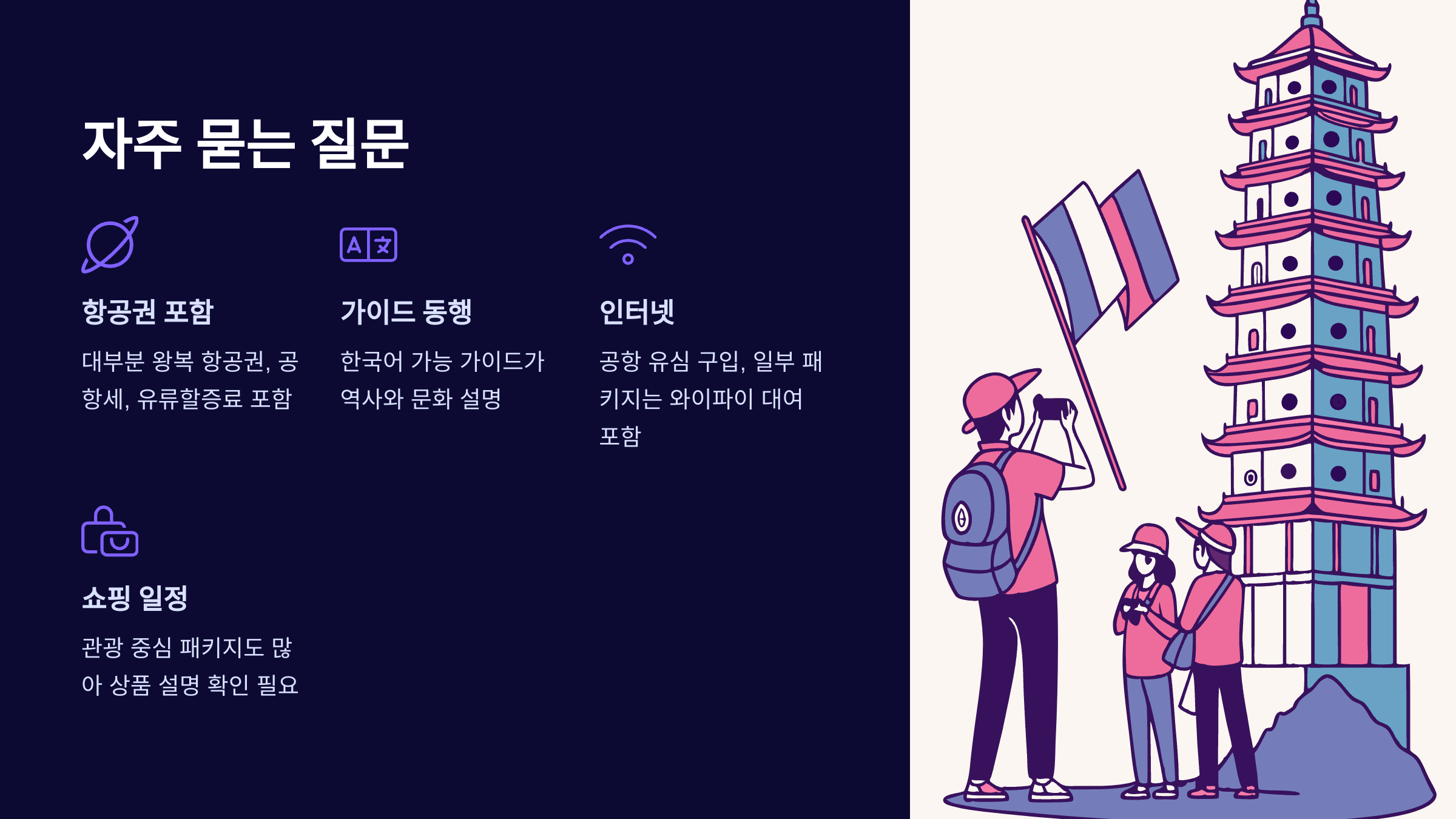 하지만 단점도 있어요. 자유시간이 적고, 모두가 같은 일정으로 움직이다 보니 유연한 일정 조정이 어렵다는 점이 있어요. 하지만 최근에는 ‘반자유형 패키지’처럼 선택지가 다양한 상품도 많아졌어요.