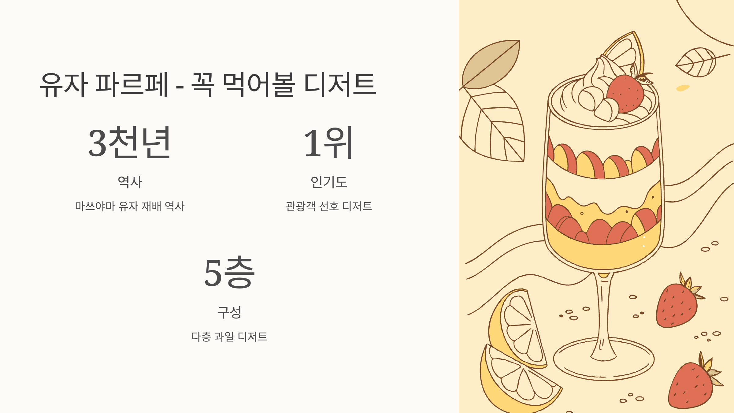 현지인 추천 맛집으로는 ‘우오노야(魚の屋)’, ‘도련님 라멘’, 그리고 과일 디저트 카페 ‘마치노키’가 있어요. 과일 가득한 유자 파르페도 꼭 한번 드셔보세요.