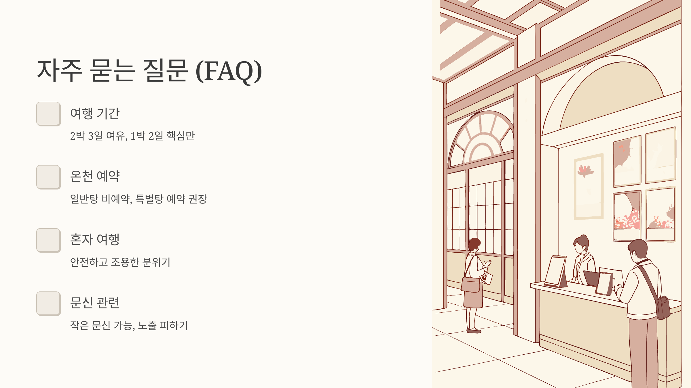 A3. 혼자 가는 여행객 많고, 안전하고 조용한 분위기라 좋아요!