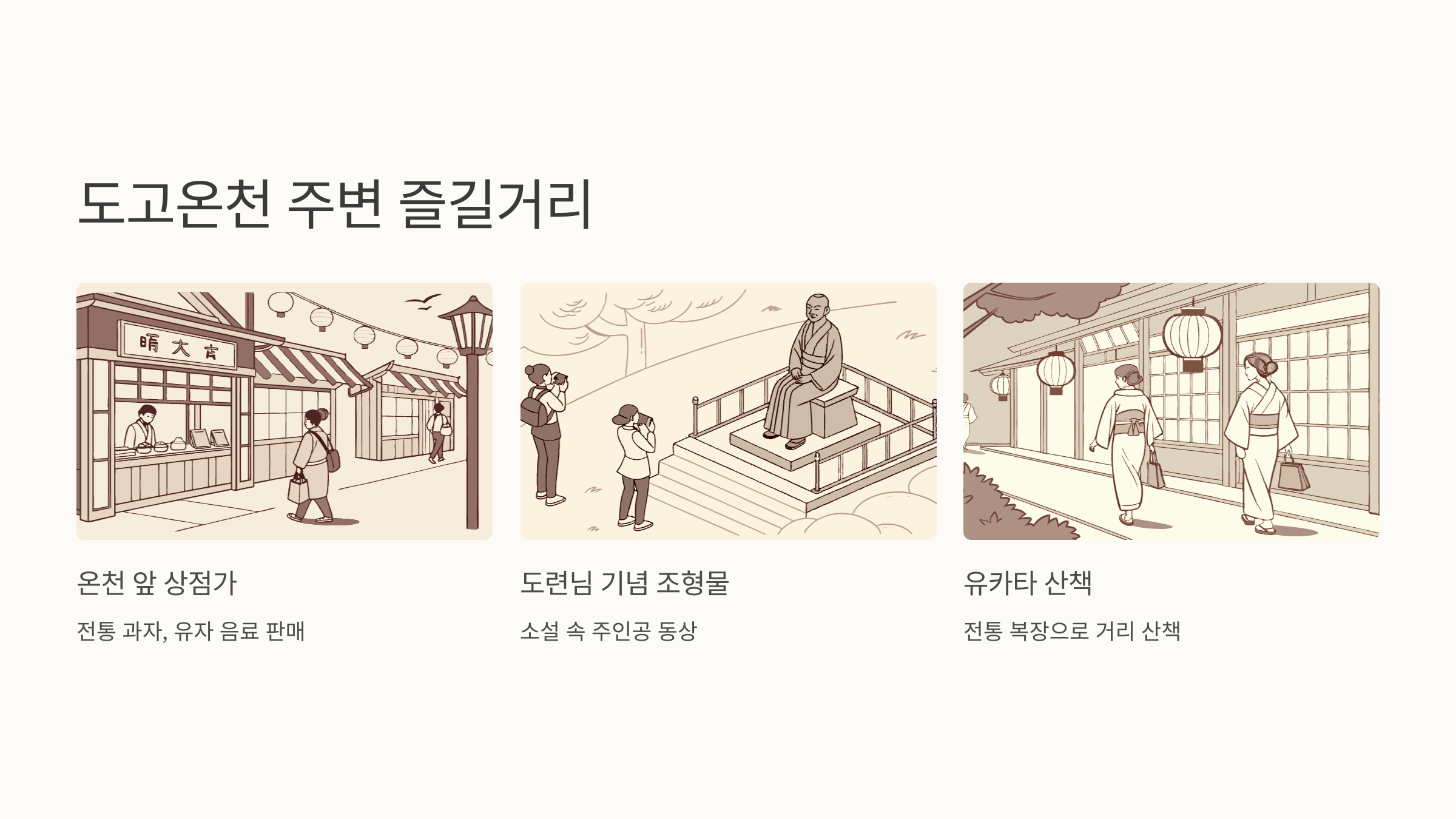 온천 후에는 본관 앞 상점 거리에서 전통 과자, 유자 음료 등을 맛보며 여유롭게 걸어보세요. 이 작은 골목들에서 마쓰야마의 진짜 매력을 발견할 수 있어요.