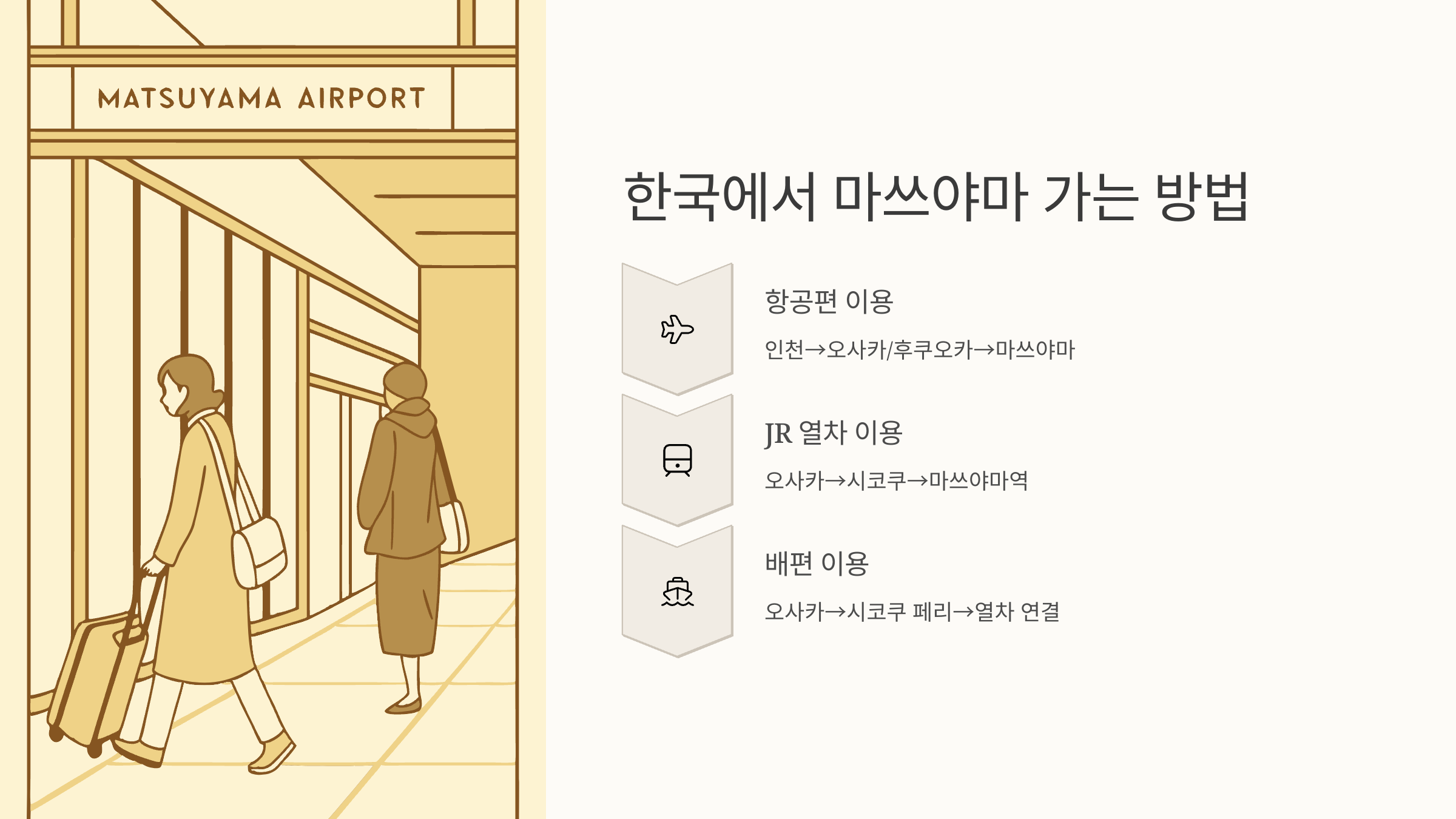 한국에서는 인천공항에서 오사카(간사이)나 후쿠오카 경유로 마쓰야마까지 이동하는 경우가 많아요. 일본 내 국내선 항공으로 마쓰야마공항 도착 후 시내까지는 버스로 20~30분 거리예요.