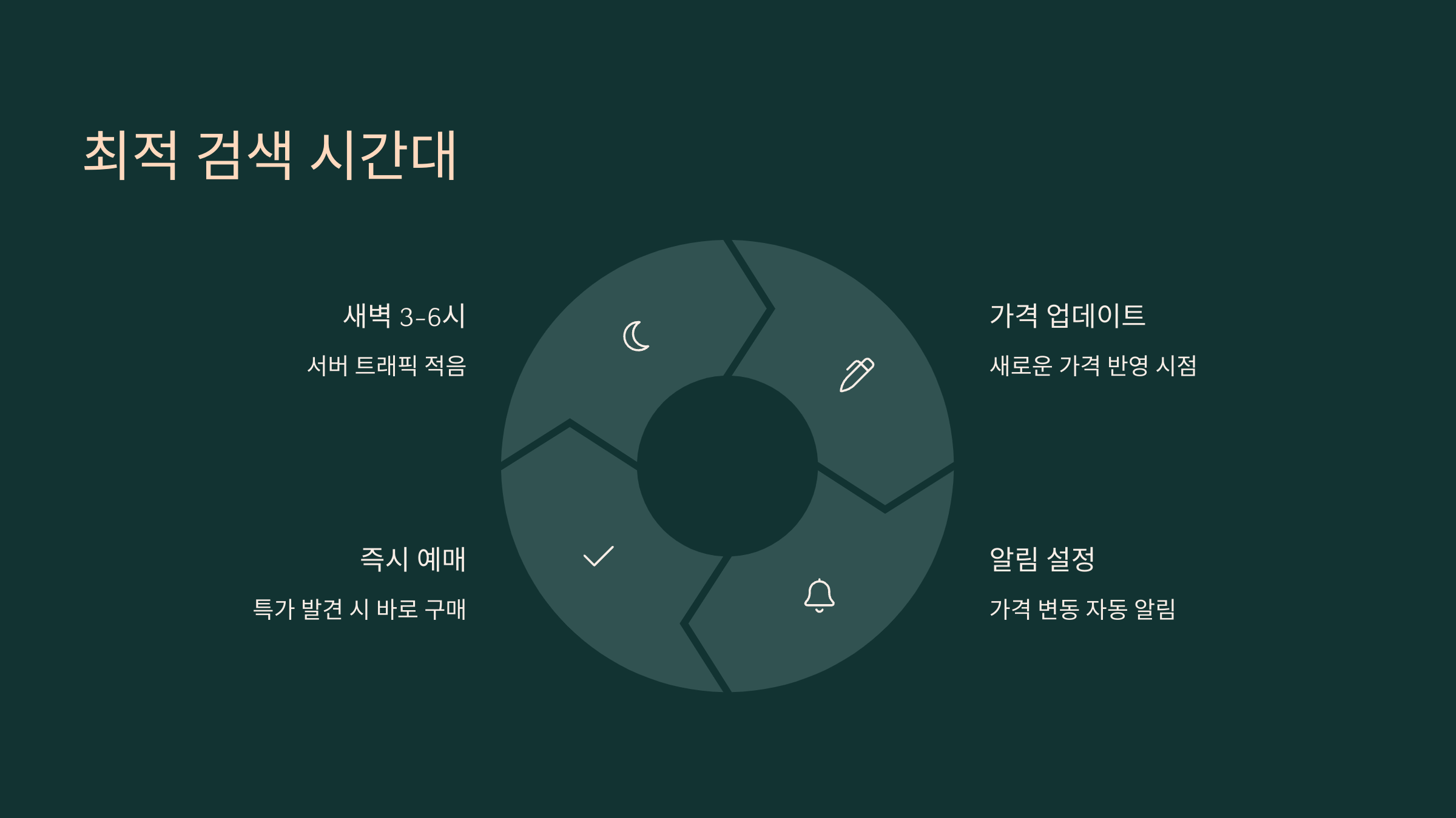 항공권 가격은 타이밍 싸움이에요. 평일 새벽 3시~6시 사이 검색은 특히 추천드려요. 대부분의 사용자가 활동하지 않는 시간이라 서버 트래픽도 적고, 새로운 가격이 업데이트되기 좋은 시점이에요.