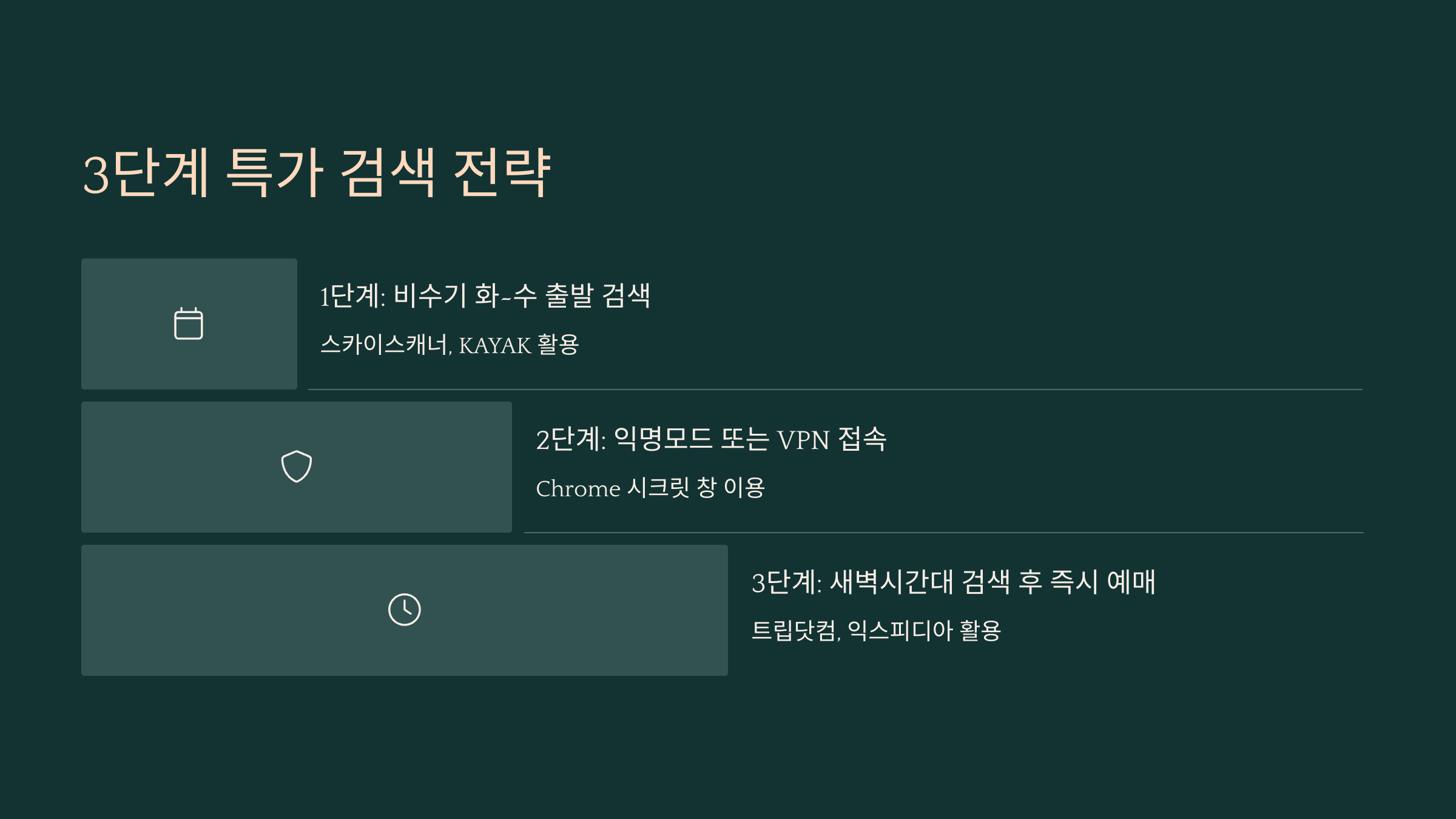 | 3단계 | 새벽시간대 검색 후 즉시 예매 | 트립닷컴, 익스피디아 |