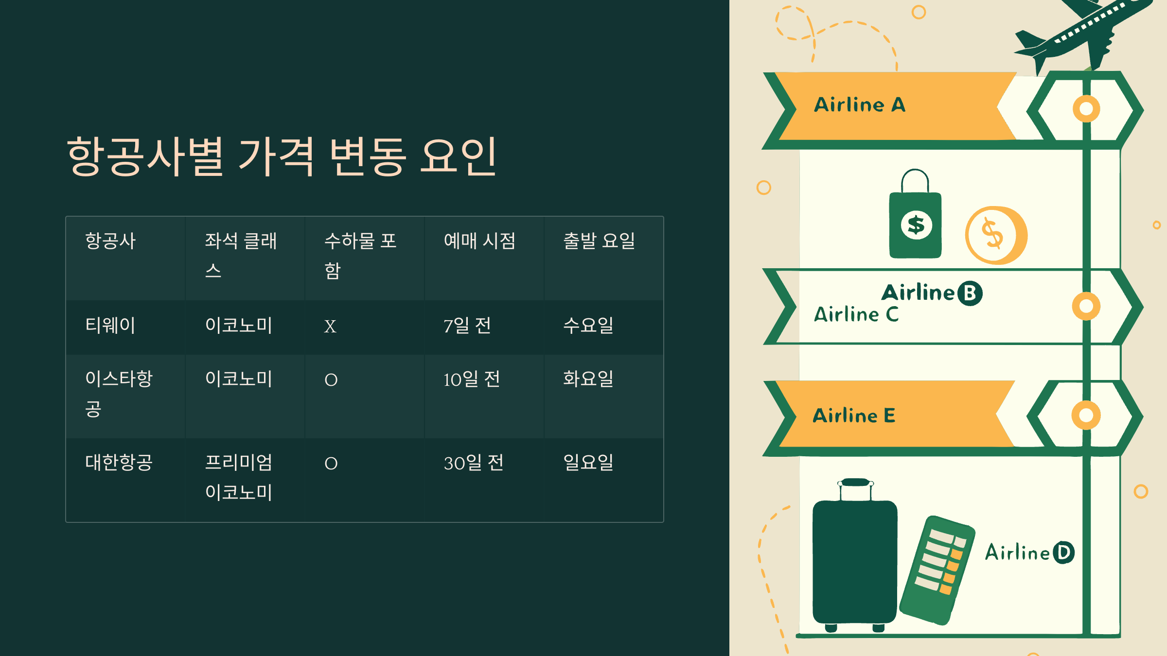 항공사 | 좌석 클래스 | 수하물 포함 | 예매 시점 | 출발 요일 |