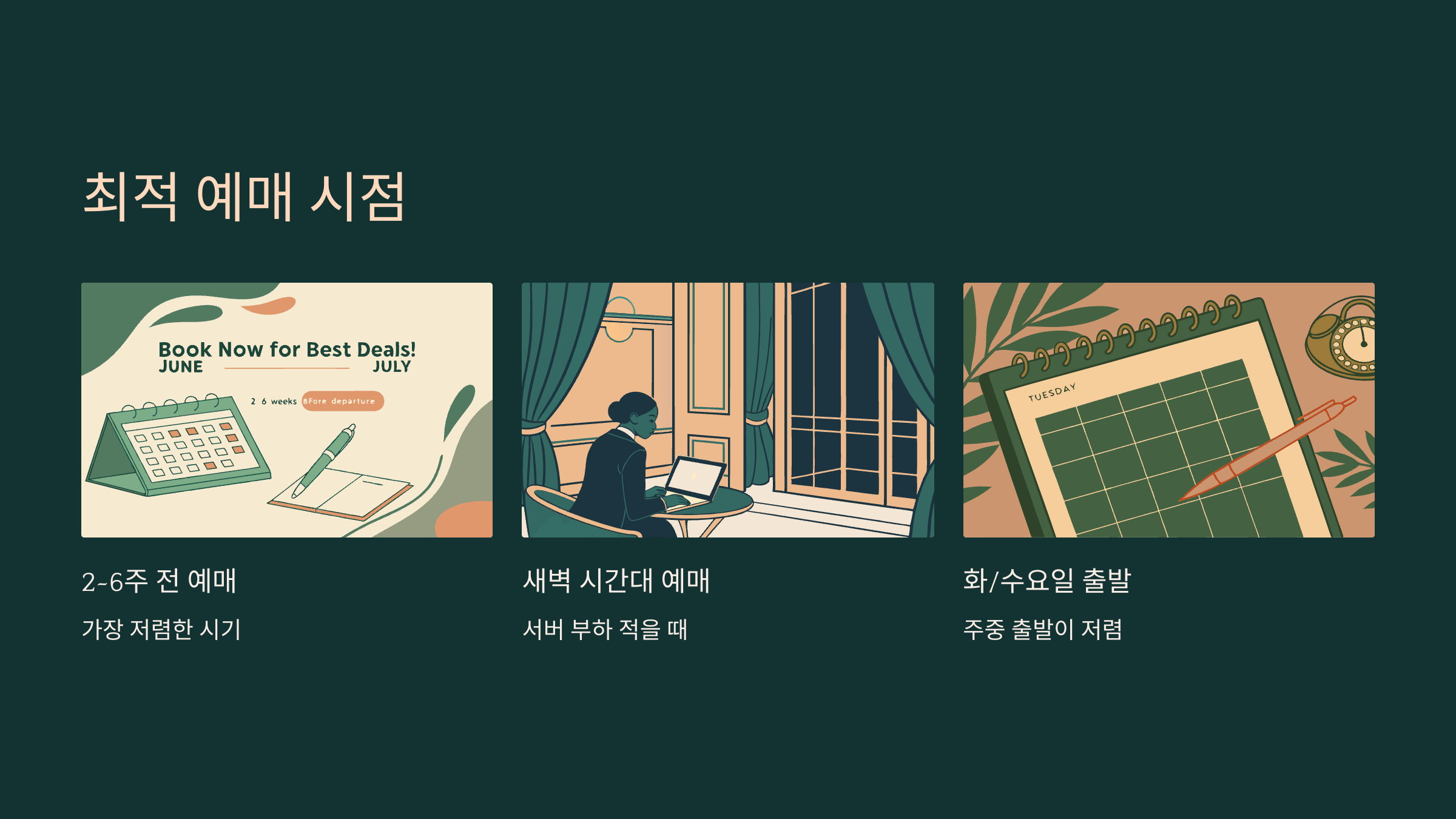 이 표를 보면 알 수 있듯이, 같은 항공사라도 예매 시점과 요일에 따라 가격이 2~3배까지 차이날 수 있어요. 제가 생각했을 때, 특가를 잡는 최고의 타이밍은 새벽 시간대예요. 검색량이 줄어드는 시간대라 서버 과부하 없이 가격이 정확하게 반영돼요.